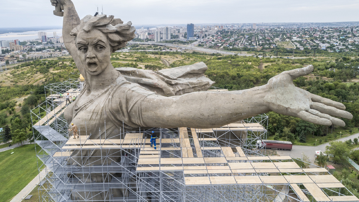 Скульптура «Родина-мать зовёт!» была построена в Волгограде 15 октября 1967 года. Являясь композиционным центром ансамбля «Героям Сталинградской битвы», расположенного на Мамаевом кургане. Железобетонная скульптура представляет собой фигуру женщины в полный рост, которая шагает вперёд с поднятым вверх мечом. Она воплощает в себе образ Родины, которая призывает своих сыновей сразиться с врагом. Общая высота памятника с пьедесталом составляет 87 метров. Высота женской фигуры — 52 метра, а с учётом длины её руки и меча — 85 метров. Длина руки составляет 20 метров, меча — 33 метра. После окончания строительства Родина-мать была занесена в Книгу рекордов Гиннесса как самая высокая статуя в мире и оставалась ей в течение 22 лет. Сегодня она входит в десятку самых высоких статуй мира, изображающих фигуру в полный рост, и продолжает оставаться самой высокой скульптурой России. «15 лет поиска и сомнений, печали и радости, отвергнутых и найденных решений. Что нам хотелось сказать людям этим памя