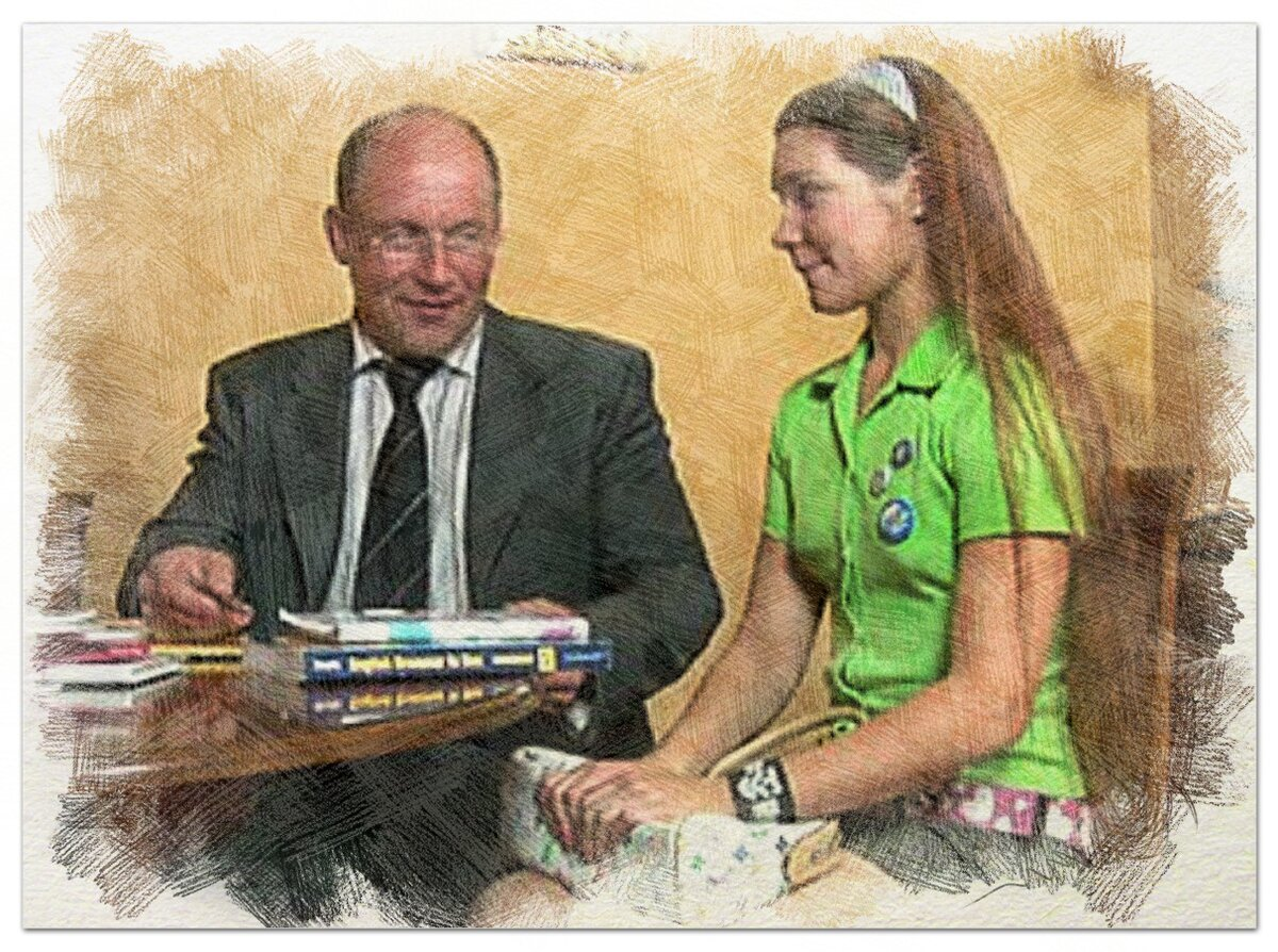 — Разумеется, — кивнул Михаил. — Вот это — наша отличница, Альбиночка. Одна из лучших учениц школы! А это — её тренер. Выдающийся человек, возглавляет наш попечительский совет. Да если бы не он…