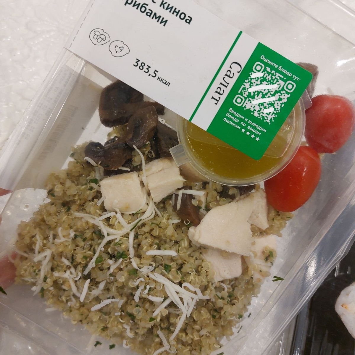 Простые ингредиенты этого покупного салата наталкивают на мысль о простоте повторения его в домашних условиях. И так, на фото можно увидеть его составляющие: киноа с зеленью (базиликом), куриное филе, грибы шампиньоны, помидоры черри и заправка на основе масла. Наиболее интересным и важным в данном салате является такой ингредиент как киноа. Киноа (Quinoa) — это растение семейства Амарантовые, которое произрастает в Южной Америке. Семена киноа имеют округлую форму и могут быть разных цветов: белого, красного, черного и коричневого. В целом данная крупа — это полезный продукт питания, который может стать отличным дополнением к рациону. Она богата белками, витаминами, минералами и другими полезными веществами, которые помогают поддерживать здоровье организма. Киноа продается во многих магазинах, как у дома, так и в крупных гипермаркетах. Так же ее можно заказать на маркетплейсах. Киноа можно использовать в различных блюдах: супах, салатах, гарнирах. Она хорошо сочетается с овощами, м