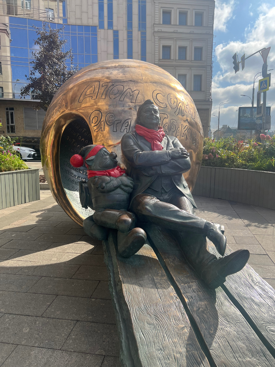 Памятник Табакову расположен в неожиданном месте - на Садовом кольце, недалеко от метро Сухаревская. Среди суеты и шума заметить "Атом солнца Олега Табакова" можно не сразу. Моя встреча с этим памятником произошла осенью 2021 года и выглядела она так: я шла по направлению к Цветному бульвару по внутренней сторону Садового кольца, и сквозь поток машин увидела на противоположной стороне что-то статичное. Пригляделась – да, действительно какой-то памятник с яркой деталью. Красный шарф обращает на себя внимание даже издалека. Я не могла не проявить любопытство, поэтому перешла по ближайшему подземному переходу на другую сторону Садового кольца. И направилась к памятнику, чтобы узнать –памятник кому или чему вдруг появился посреди улицы. Место для памятника не случайно? Конечно, не случайно. Если пересечь улицу Гиляровского, которая идет перпендикулярно Садовому кольцу, то вы уткнетесь в здание Московского театра Олега Табакова на Сухаревской, а попросту - "Табакерку". Кстати, про Садо