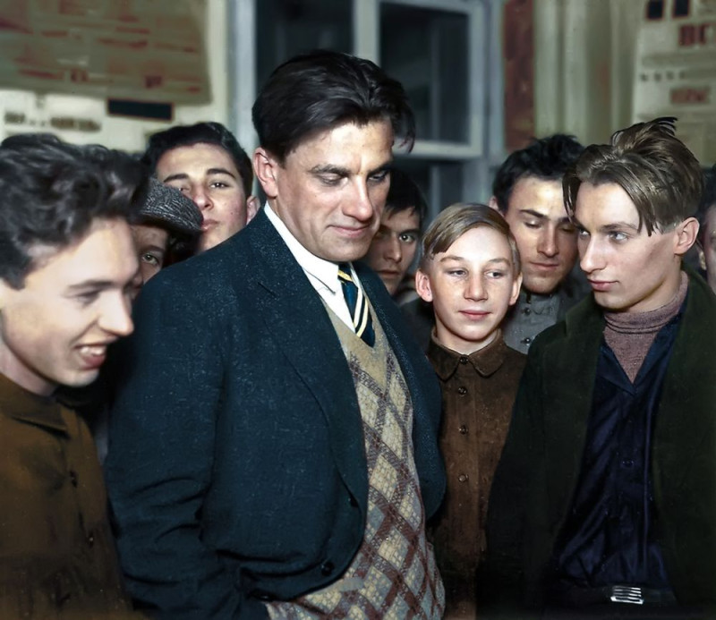 Слева направо: японский писатель Тамидзи Найто, поэт Борис Пастернак, режиссёр Сергей Эйзенштейн, актриса Ольга Третьякова, Лиля Брик, Владимир Маяковский, дипломат Арсений Вознесенский и переводчик с японского. Москва, СССР, 11 мая 1924
