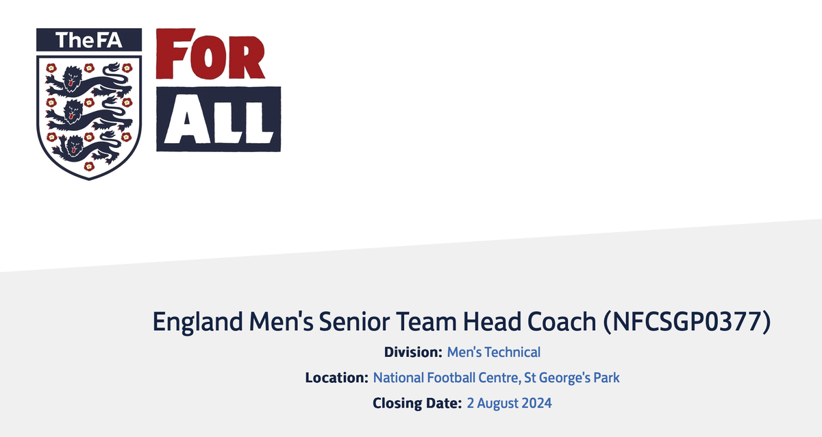 Подходите? Футбольная ассоциация Англии (FA) ищет замену Гарету Саутгейту. Даже разместили вакансию на сайте FA – и озвучили несколько важных требований для возможного кандидата. Кто же подходит на роль главного тренера топ-сборной? Нужно «вдохновлять нацию и создавать позитивную атмосферу». А еще? В сообщении подчеркивается, что ряд кандидатов уже определен, но FA заинтересована в получении новых заявок от специалистов, которые соответствуют определенным критериям. Организация придерживается «открытого процесса найма». Вот в чем заключается роль главного тренера: 1. Возглавлять и развивать мужскую сборную Англии, чтобы выиграть крупный турнир и неизменно входить в число лучших команд мира; 2. Обеспечить вдохновляющее руководство многопрофильной командой специалистов мирового класса в St George’s Park (база сборной Англии); 3. Развивать и поддерживать прочные отношения с клубами, где выступают английские игроки. Успешный кандидат должен: ● Обладать лицензией УЕФА Pro; ● Иметь значитель