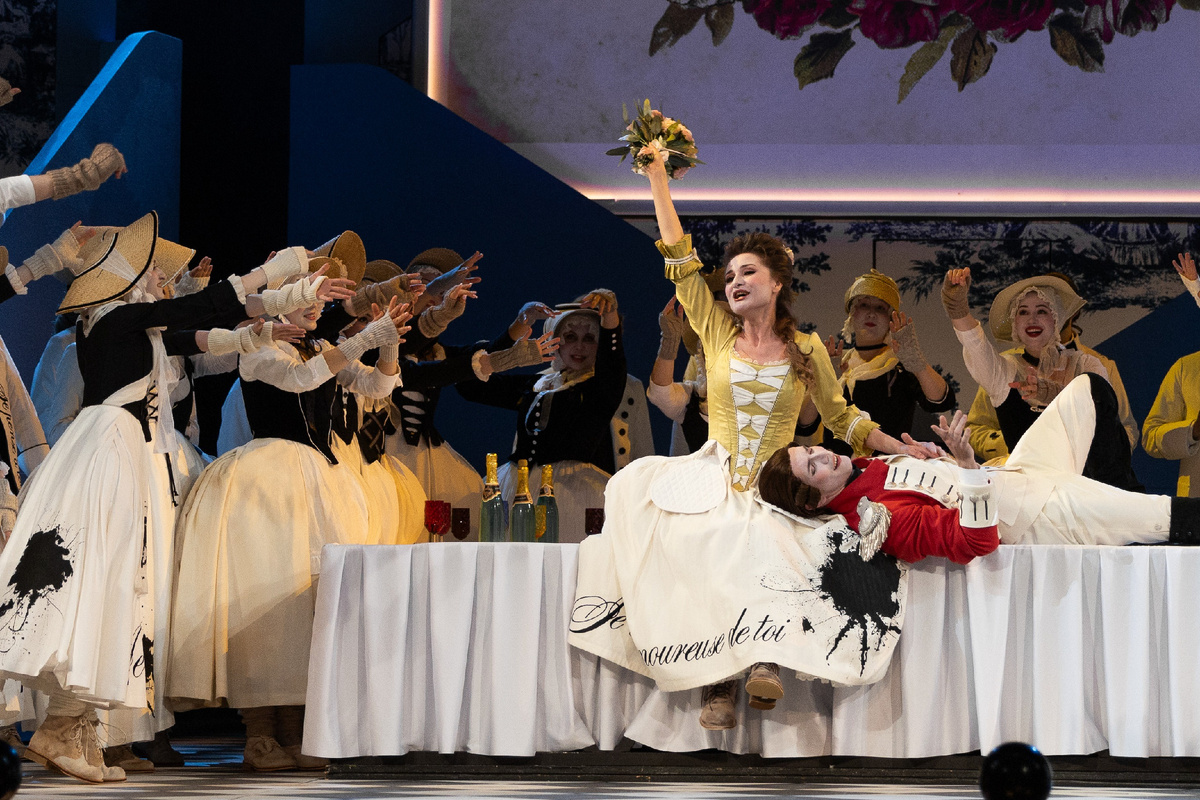 Красивая сценография в виде почтовых открыток, элегантный стёб над оперными штампами, но что еще больше порадовало - это наличие двух конферансье (опытного и начинающего операмана), которые рассказывали со сцены сюжет, "юморили" и выступали в роли "проводников" для широкой публики. Отличный прием для привлечения новой аудитории на оперу.
