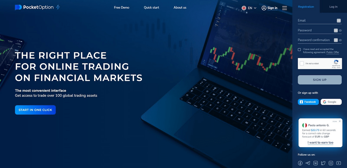 Просто нажмите кнопку “Бесплатная демо-версия” на домашней странице Pocket Option, чтобы начать.