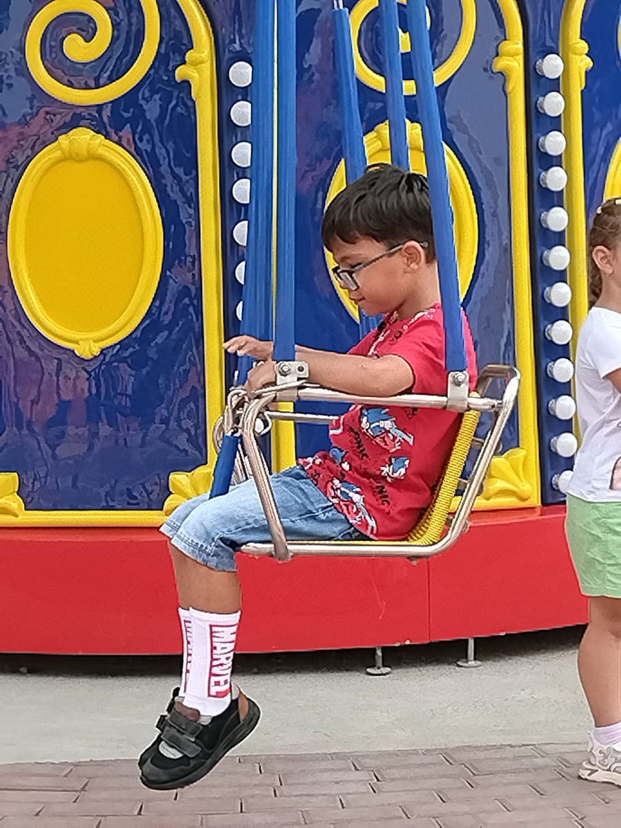 На следующий день Иван с Аленой остались дома, Руська тоже после аквапарка никуда идти не захотел. А у нас оставалось еще много билетов на аттракционы в парке "Вокруг света", так что мы решили съездить и докатать их. Этот парк вообще очень всем понравилась. Даже Иван высказал сожаление, что у нас в городе таких новых аттракционов нет. К тому же там аттракционы на абсолютно разный возраст. Егорке вот эти цепочки очень понравились. Это нечто среднее между детскими цепочками по кругу и взрослыми. Ось вращаясь слегка наклоняется под углом и поднимаются они над землей выше. Еще один плюс, это то, что почти на все экстремальные аттракционы пускают от роста 120 см. Так что девчонки "пощекотали себе нервы", полетав вниз головой. На удивление им понравилось На машинках думала кататься будет только Егор, но захотели все. Небо стало затягивать тучами, но решили все же докатать билетики. Сходили на маленькие американские горки. Прокляла все. "Гусеница" и "Ракушки", вот предел моего экстрима :))))