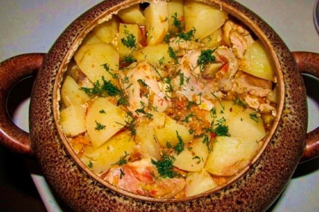 - Кладем на дно каждого горшочка по пол чайной ложки сливочного масла, перетертого с чесноком, посыпаем зеленью (базилик) или прованскими травками. Затем кладем порезанный кубиками картофель, поливаем мясным бульоном и полусухим вином (1-2 ст.л.). Затем выкладываем обжаренные овощи с грибами и мясо. Посыпаем специями и немного присаливаем. Заливаем содержимое горшочков сырно-яичной массой так, чтобы она полностью покрыла мясо.