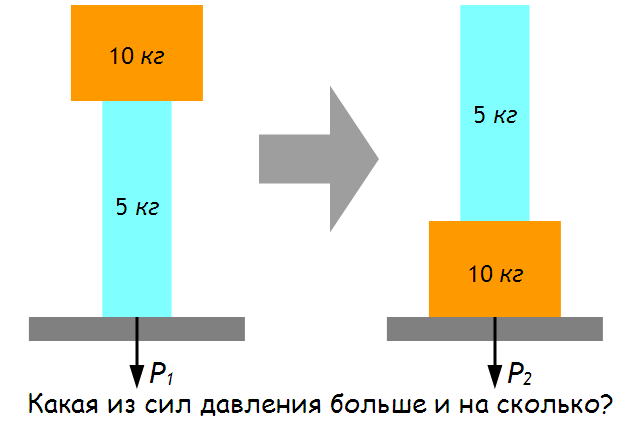 Давайте рассмотрим одну идеализированную физическую модель. У нас есть плоское горизонтальное неподвижное основание, на которое мы ставим легкое тело (груз) массой 5 кг в форме цилиндра, а затем сверху на него кладем тяжелый цилиндр массой 10 кг. Далее мы производим измерение силы давления P1 этой конструкции на основание. После этого мы меняем местами легкий цилиндр с тяжелым и повторно измеряем силу давления P2 видоизмененной конструкции на основание (см. рисунок ниже).