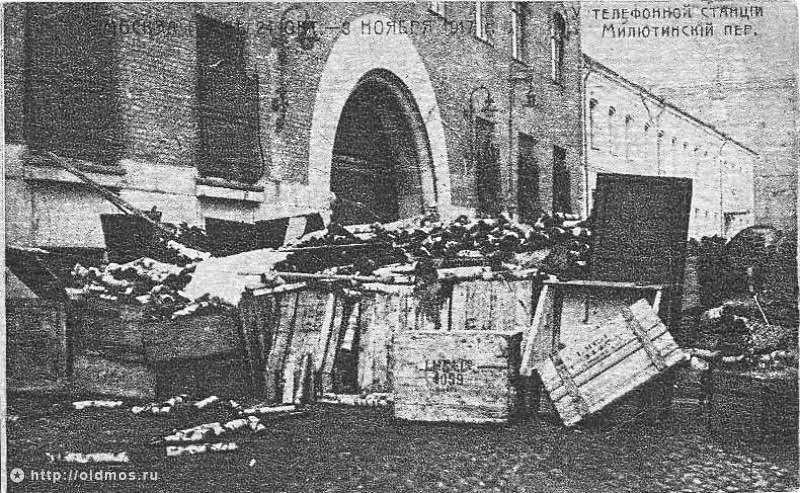 "...1 ноября в среду попытался пробраться в контору, где на моей ответственности большие деньги и документы, но дошел закоулками и переулками лишь до Лубянского проезда, дальше идти было невозможно: по Лубянской площади летели снаряды, шрапнели и пули. Говорят, юнкера отчаянно защищают здание телефона и Кремль Почтамт и телеграф в руках большевиков. Возвращался домой под музыку выстрелов. Над головой и где-то близко, незримо, свистели пули, ударяясь в стены домов, разбивали стекла, грохотали по крышам, ранили, убивали и пугали мирных обывателей, а также - ворон и голубей. При этом путешествии подвергся двум обыскам, нет ли при себе оружия..." Н.П.Окунев, Дневник Москвича 1917-1920