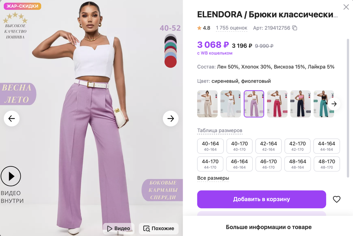 Приветствую уважаемых и прекрасных читательниц! 🌼 Я решила поделиться с вами замечательными повседневными находками с Вайлдберриз. ‼️ Хочу отметить, что данная статья не является спонсированной и предназначена исключительно для информационного и развлекательного ознакомления. Она не призывает к покупкам. Здесь я просто делюсь товарами, которые меня заинтересовали, и никоим образом не настаиваю на их приобретении. ПРОДОЛЖАЯ ЧТЕНИЕ, ВЫ ПОНИМАЕТЕ И СОГЛАШАЕТЕСЬ С ТЕМ, ЧТО ДАННАЯ СТАТЬЯ НЕ СОДЕРЖИТ РЕКОМЕНДАЦИЙ ПО ПОКУПКЕ ОПРЕДЕЛЕННЫХ ПРЕДМЕТОВ И ТОВАРОВ. ‼️ Летние повседневные брюки для женщин, которые облегают фигуру и имеют полную длину, придают офисным нарядам элегантность и создают визуальный эффект удлиненного силуэта. Классические брюки с высокой посадкой идеально подходят как для высоких, так и для невысоких девушек, а также для женщин среднего и низкого роста. Благодаря особому материалу, свободные летние женские брюки сохраняют свою форму и не растягиваются при носке. Артикул: 2