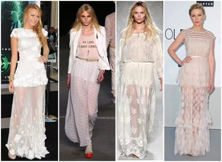Прозрачные ткани, такие как органза, стали популярными, создавая романтический образ. На показах Mugler, Prada и Blumarine эти ткани создают эффект легкости и воздушности. Асимметричные вещи продолжают оставаться в тренде, но на показах сезона весна-лето 2024 они приобрели новые, интересные формы. Особенно выделяются рубашки с одной плечевой линией, как у Dior и Dries Van Noten. Перчатки вернулись в моду как стильный аксессуар, а не только для тепла. На показах Givenchy и 3.1 Phillip Lim они представлены в различных материалах, включая капрон и органзу. Футуристические очки необычных форм стали трендом, особенно выделяются модели от Acne Studios и Balenciaga, которые изменяют облик носителя. Рианна сделала открытый живот модным элементом, и дизайнеры Schiaparelli, Acne Studios и Alberta Ferretti подхватили эту идею, представив платья с вырезами в области живота. Юбки с акцентом на детали, такие как пайетки и фотопринты, стали основным элементом образа. Дизайнеры Proenza Schouler и N°21