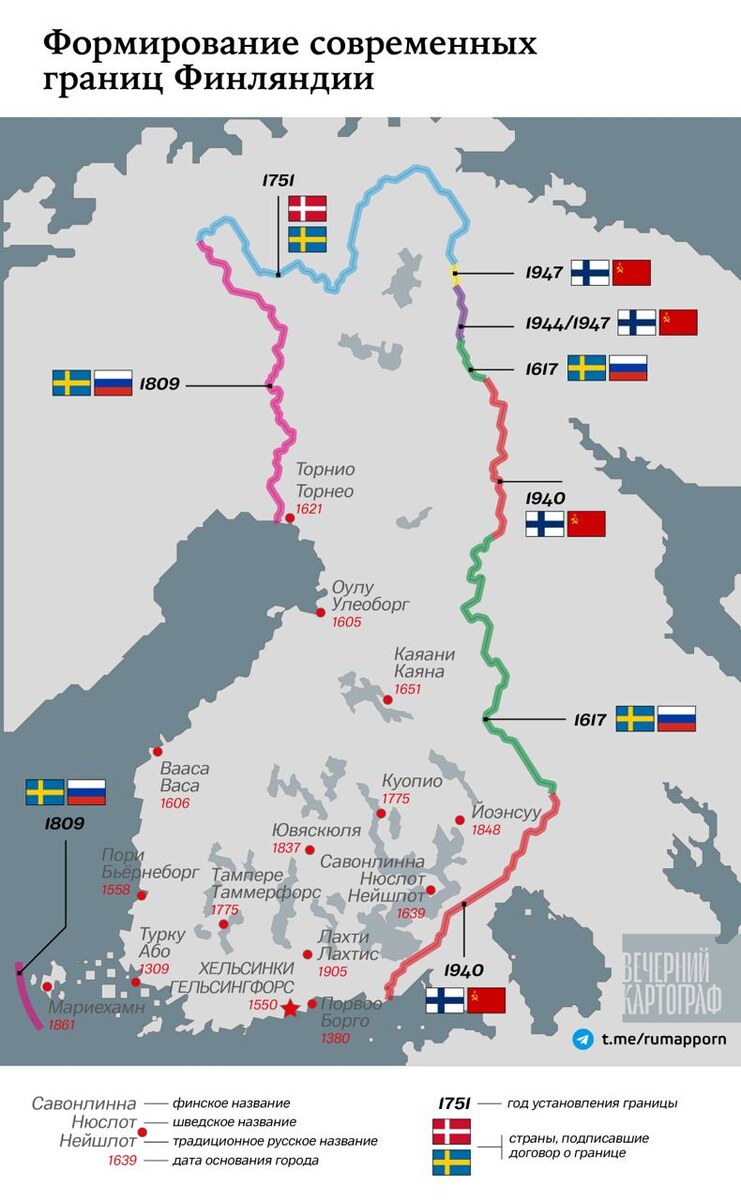 Это продолжение цикла статей о формировании границ Финляндии. Начало – здесь. Практически все современные границы Финляндии так или иначе связаны с Россией, вот карта и краткий обзор со ссылками на соответствующие статьи этого цикла: 1617: Столбовский мир, завершивший русско-шведскую войну 1610-17 1751: Стрёмстадский договор, по которому была проведена граница между Швецией и датской Норвегией в Лапландии 1809: Фридрихсгамский мир, завершивший русско-шведскую войну 1808-09. Россия забирает у Швеции Финляндию, Аланды, Остроботнию и Лапландию 1940: Московский договор, завершивший советско-финскую войну 1939-40 1944: Московское перемирие, завершившее участие Финляндии во Второй мировой войне на стороне Германии 1947: Хельсинский договор о покупке Советским Союзом сектора Янискоски — Нискакоски Но про Финляндию это еще не все ) В заключение – немного лирики, но это в следующий раз.