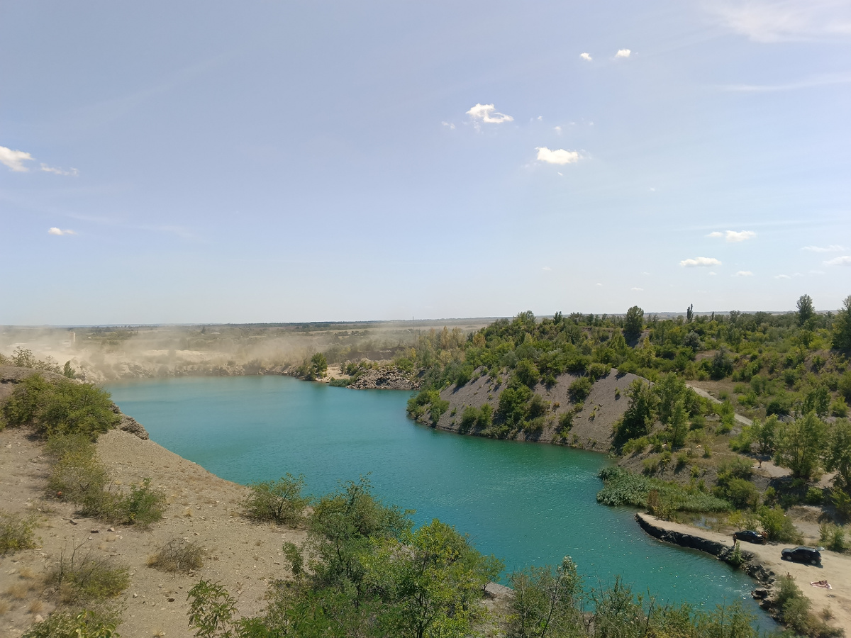 Всем приветик, сегодня я решила улучшить качество своей жизни и спонтанно собралась в велопоход. Давно на карьере не была, а останавливало то, что там вначале часть пути в горку. Доехала я как -то туда на велике и эта горка меня остановила. Года два там не была. На этот раз не остановила. Я более тренированная и поездка получилась для меня легкая. Туда -да, немного в гору, тем более в неизвестность -я на велике не ездила никогда. Одна, суббота, машины дорогущие проносятся мимо. Оттуда -вообще сказка -почти все время под гору. При подъезде к карьеру я знала, что есть два заезда - официальный и свернуть направо - неофициальный. Я свернула сразу же интуитивно в лесок , там оказалась хорошая дорога - раньше ее не было - видно много отдыхающих любят это место. Проехала по дороге и вышла на вершину карьера. И тут я попрощалась с мыслью искупаться. Вот просто поняла, что я ехала по жаре час - и не искупаюсь. Потому что в этом месте спуститься невозможно. Налево - видите, все в пылюк