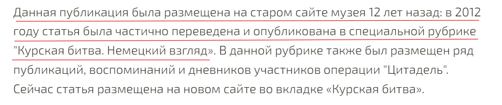 История с музеем-диорамой "Курская битва" оказалась еще более возмутительной, чем в самом начале, хотя казалось бы - куда больше? Однако руководство музея в попытке оправдать публикацию на сайте пропагандистской статьи немецкого историка-ревизиониста Карла-Хайнца Фризера не остановилось на этой гнусности и пошло еще дальше. Оно попыталось все свалить на предшественников, опубликовав объяснение, в котором заявлено, что статья была опубликована на старой версии сайта, а на новую просто неудачно перекочевала. Это ложь. Директора музея Елену Чефонову подвело слабое знание реалий интернета. Она не догадывалась, что есть специальный сервис, который архивирует все веб-ресурсы интернета, что позволяет посмотреть сайты в том виде, в котором они существовали в тот или иной момент времени. И на старой версии сайта музея-диорамы "Курская битва" такой публикации не обнаруживается. Да и рубрики "Курская битва. Немецкий взгляд" не существует. Впервые данная статья опубликована на сайте в 2023 году