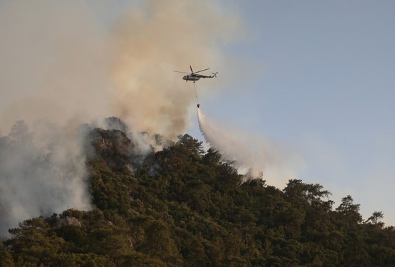Крупный пожар на курорте. Самолеты и вертолеты пытаются спасти лес