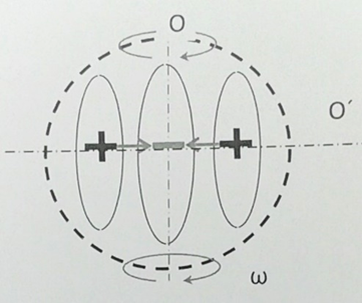 Условно оси «вращения» субчастиц находятся на линии О´. Спинорное движение протона представлено как момент вращения относительно оси О. Такое строение протона противоречит формальным представлениям, основанным на «кварк-глюонной чепухе». Принцип неопределенности запрещает существование электрона внутри нуклона, размер которого всего ~0,8 Фм. Но, следует учитывать два обстоятельства. Во-первых, электрон присутствует в протоне в виде партона – субчастицы иного континуума. Во-вторых, размер нейтрона – это релятивная величина, которая существенно меньше собственного значения. Топологию лептонной материи мне удалось доказать численными оценками в книге «Философия и физика континуума...». В новом понимании пространство нуклона «из внутри» больше релятивно наблюдаемого размера в 1/α^2=18769 раз (!). Противоречие исчезает, но это ещё не всё! Рассмотрим, как возникает масса протона.