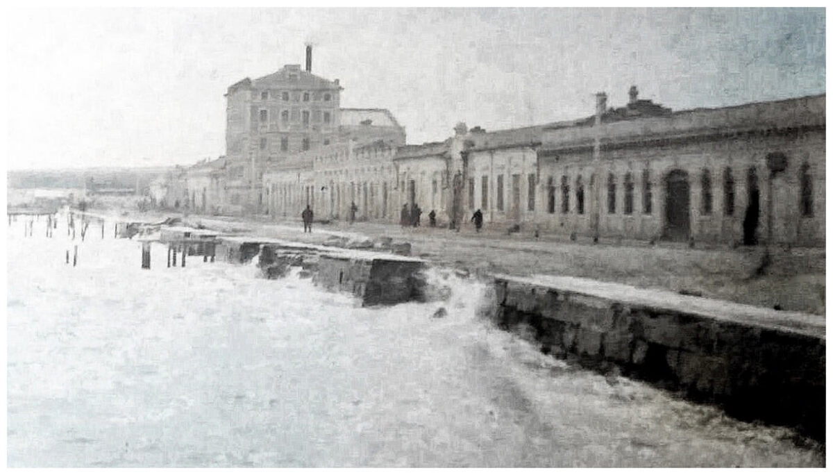 ▫Александровская Набережная, мельница Обершмуклера. Фото: 1890-е годы Пляж на набережной, дом Гинзбурга – улица Айвазовского, 9А. И бывшая мельница Обершмуклера - сейчас жилой дом, в котором кафе-бар "Вкус Жизни" - улица Айвазовского, 7