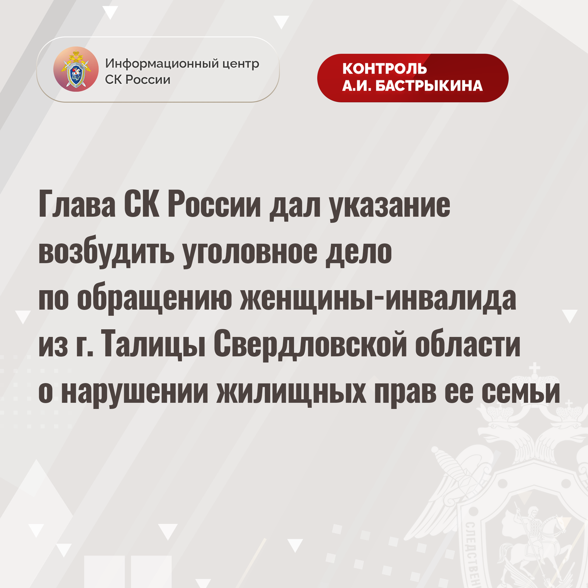 Глава СК России дал указание возбудить уголовное дело по обращению женщины-инвалида из г. Талицы Свердловской области о нарушении жилищных прав ее семьи