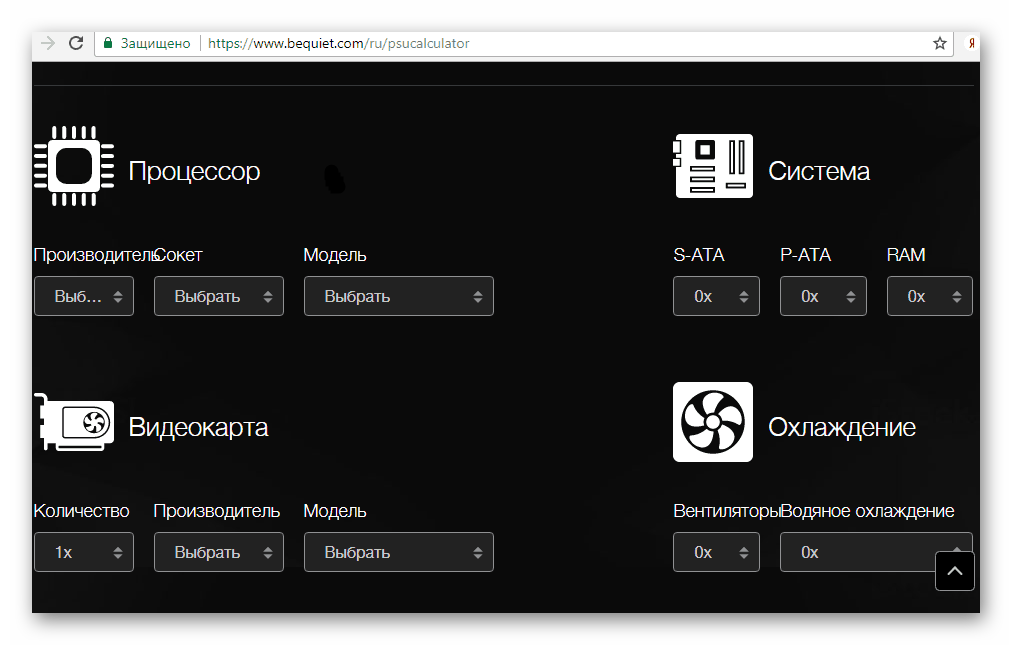 Существуют специальные сайты калькуляторы мощности блоков питания. Вам потребуется выбрать все установленные компоненты системного блока, чтобы отобразилась оптимальная мощность. В результат учитывается дополнительное 30% от значения, поэтому вам не нужно делать это самостоятельно, как было описано в предыдущем способе.
