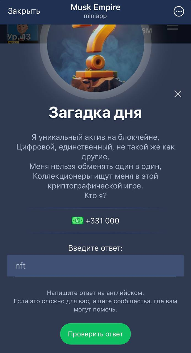 В Musk Empire Маск Империя появились новая загадки дня 20.07-21.07.24, ее найти можете в разделе Квесты - загадка дня Ответ: nft Наш telegram канал https://t.me/criptohomyachki