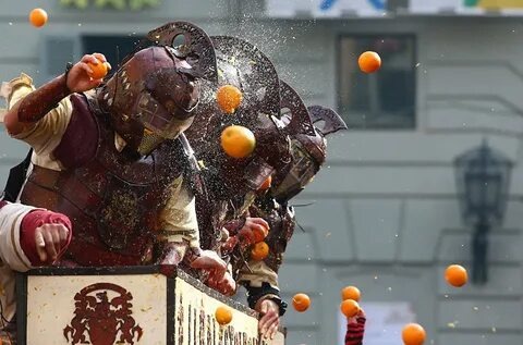 «Битва апельсинов» — это яркий и необычный фестиваль, проходящий в итальянском городе Ивреа в регионе Пьемонт. Событие происходит ежегодно в период с 18 по 21 февраля и является частью празднования карнавала. Этот фестиваль имеет глубокие исторические корни, восходящие к средневековью. Существует несколько легенд о происхождении «Битвы апельсинов». Одна из них связана с восстанием против местного тиранского правителя, который пытался злоупотреблять своими полномочиями. По другой версии, традиция возникла в честь освобождения города от гнета и коррупции. В течение трех дней праздника город делится на несколько команд, каждая из которых представляет разные группы и традиционно носит определенные цвета. Основная часть праздника — это масштабная битва, где участники метают апельсины друг в друга. Эта битва происходит на улицах города, и зрелище очень красочное и бурное. В «Битве апельсинов» принимают участие несколько команд, представляющих различные районы Ивреа. Участники носят защитн