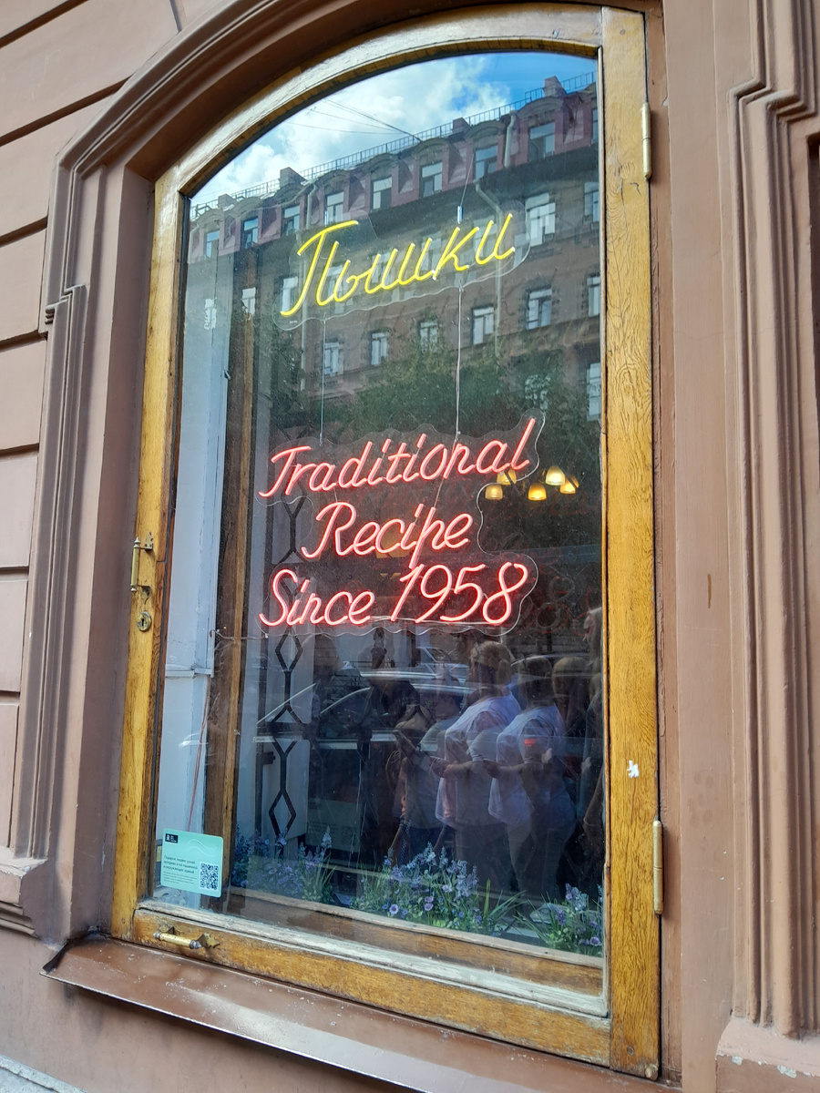 Дождливый день девятый выделился только этим событием. А так просто гуляли по району, ничего примечательного. День десятый, то есть вчера, обещал быть дождливым. Яндекс рисовал ливни до 9 часов вечера. Однако обошлось. Утром муж съездил на Уделку, суббота ведь была, об этом есть отдельная статья. А потом поехали гулять по центру Санкт-Петербурга. Первой целью стала знаменитая пышечная на Большой Конюшенной. Нам даже повезло! Когда мы тут оказались, очередь на улице только начиналась. Пока мы с двойняшками ждали на улице Лизу с папой (которых, конечно, отправили за пышками), очередь значительно выросла. Что такое пышки? Любой коренной петербуржец вам скажет, что это совсем не то же, что пончики! И мы подтверждаем 😉😀. Смотрите сами, ну разве это пончик? Тем более, когда вдалеке виднеется Невский проспект! Самая настоящая пышка! Отведали мы пышек петербургских. Не поверите, но первый раз в жизни. Благодаря невероятному ажиотажу пышки свежайшие! Их только и успевают готовить. Поэто