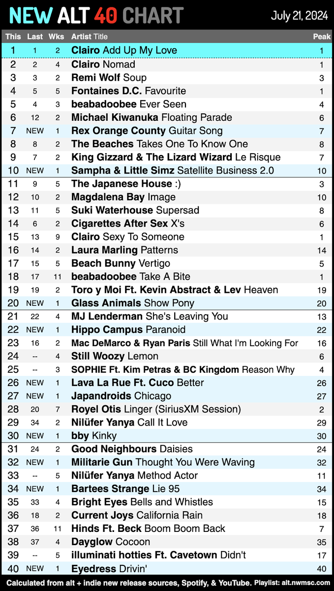 CLAIRO - продолжает удерживать вершину чарта обоими своими песнями: лучший дебют прошлой недели, Add to my love - на первом месте, а Nomad - на втором.