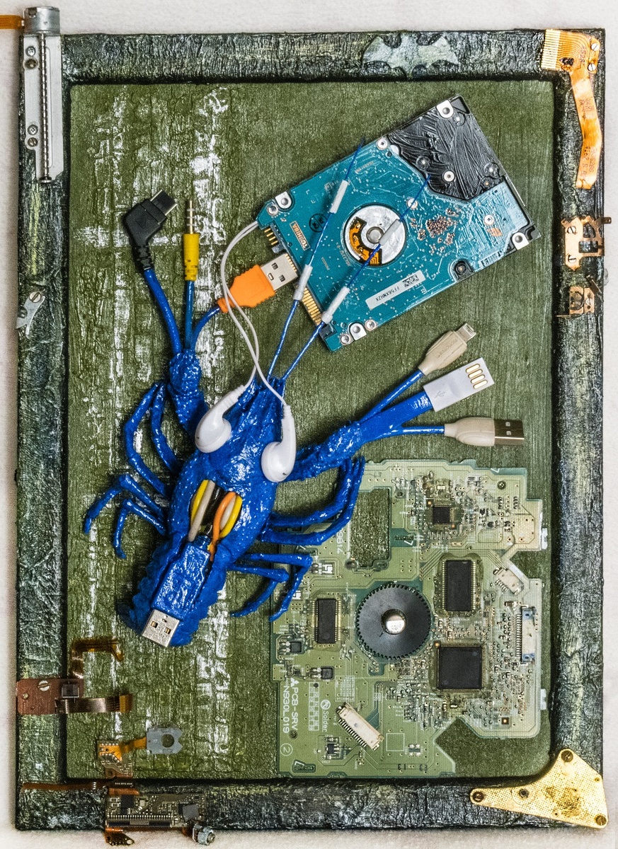Рак, жесткий диск, электронные платы, электронные кабели, рабочие механизмы, акрил, холст, декоративные элементы