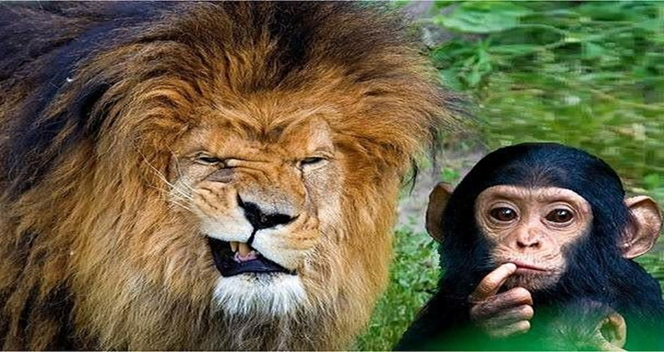 Лев поймал обезьяну на бегу, зарычал, в одно мгновение разорвал обезьяну на две части.