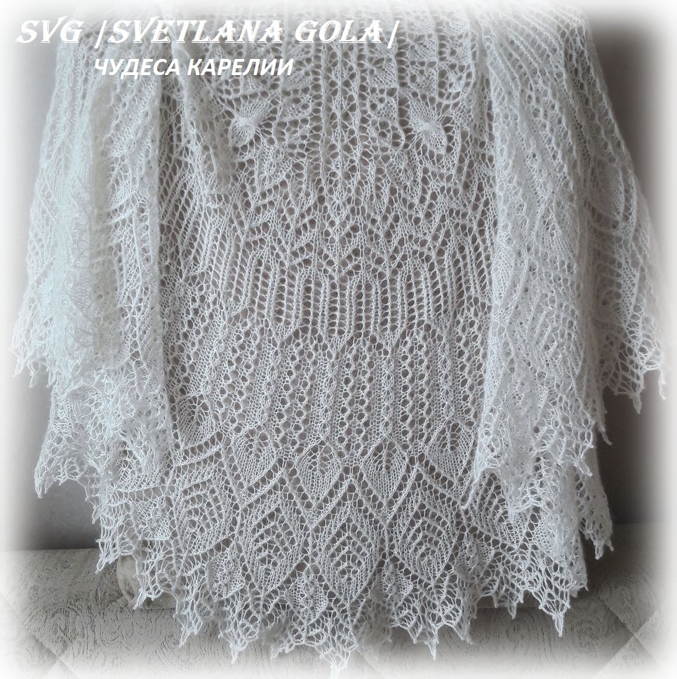 Всем доброго дня! Я почти совсем ничего не вяжу в последнее время. Что-то пробую, не нравиться, начинаю еще что-то - опять не то Неделю назад мои дети ухали отдыхать и у меня появилось свободное время.... много! И за несколько дней я довязала шаль, которая была начата пару месяцев назад. Этот дизайн я повторяла уже несколько раз Автор Ксения Голубева, шаль под названием "Чудеса Карелии" Я увеличила размер, внесла изменения в последние ряды под закрытие крючком. В оригинале предлагается закрывать спицами Вот такая нежная, обнимательная красотка получилась Пряжа Италия кид мохер 900/100 и меринос суперфайн 1800/100 цвет белый