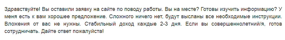 На каком-то сайте меня заинтересовала вакансия и я им задала вопрос. Оказалось, что объявление лишь приманка. Дальше развитие событий представляю в скринах нашей переписки. Ёжику понятно, что сейчас будут пробовать нае...ать. Решила посмотреть вживую, как это происходит. Мне прислали такую инструкцию: Схема обмана стала понятна. Идём дальше. Мне присылают инструкцию, как запустить робота для торгов на платформе. Там запускается тестовый режим под видом настоящих торгов. Всё это общение происходит в течение нескольких дней. Я жду - ну когда же? А далее приходит такое письмо: Пишу ответ: Товарищ занервничал: Уже понимая, что погорел, товарищ не оставляет надежду хоть что-то получить, хотя проскальзывает раздражение, и продолжает втирать: Отвечаю: Товарищ сдулся. Деловой тон исчез: Отвечаю: Вот такой успешный бизнесмен мне попался.