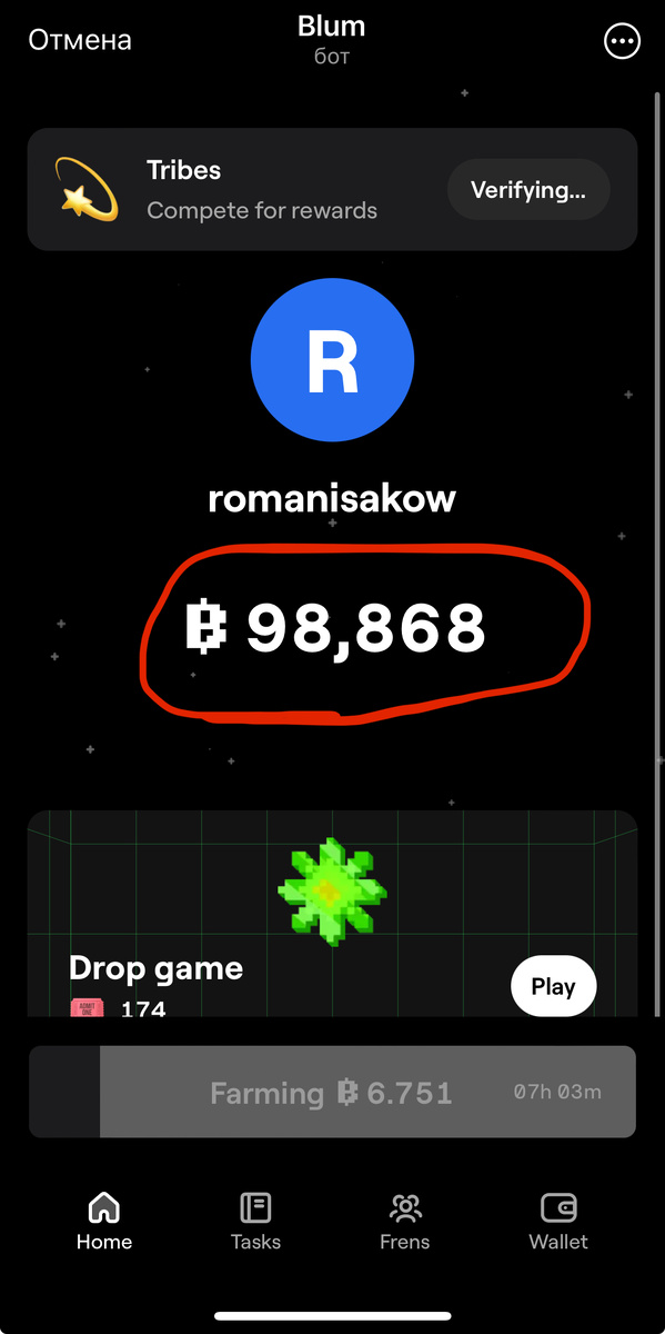 Проект который запустили пару месяцев назад, но еще не поздно зайти, так как выход токена в Q4. Что делать? 1. Заходим в приложение BLUM 2. Нажимаем Create account 3. Вводим Nickname и жмем Continue 4. Нажимаем Start farming 5. В разделе Tasks выполняем задания, за это также начисляют поинты( можно просто тыкнуть start и вернуться обратно) Заходим каждые 8 часов и делаем “Claim” собираем монеты, ждем дроп. За подобную активность пользователей и пользованием проекта, поощряют токенами, которые мы успешно продадим. Активность абсолютно бесплатная, подобный проект Notcoin уже раздал свои токены и получилось хорошо заработать, здесь думаю будет не хуже. Доход будет зависеть от количество ваших поинтов, я думаю от 200-500$ смело насыпать смогут. Также уже можно привязать свой кошелек, а значит дроп будет 100%. Мой канал с бесплатными вознаграждаемыми активностями - ссылка