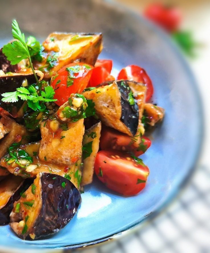 Подготавливаем все продукты. Баклажаны моем, нарезаем на крупные треугольники или кубики, выкладываем в миску с холодной подсоленной водой. Перемешиваем ложкой, пусть они немного пропитаются водой. Откидываем на дуршлаг, чтобы стекла лишняя влага. Томаты черри моем, сушим и нарезать на четыре части. Чеснок чистим и рубим в мелкую крошку. Мелко крошим чистую, просушенную кинзу. Перекладываем баклажаны в миску с крахмалом и перемешиваем ложкой. Благодаря этому ингредиенту баклажаны получатся с аппетитной корочкой и нежным мякишем внутри. Опускаем баклажаны во фритюр и жарим примерно 5 минут. Температура масла должна составлять 200°C. Так как у меня нет фритюрницы, я жарю их в сотейнике. Погружаю в хорошо разогретое масло небольшими порциями. Шумовкой достаем готовые баклажаны и выкладываем на салфетку, чтобы стекло лишнее масло. Тем временем готовим заправку. Смешиваем соевый соус, соус чили, измельченный чеснок, соль, кинзу и свежемолотый перец. Хорошо перемешиваем. В глубокую миску вы