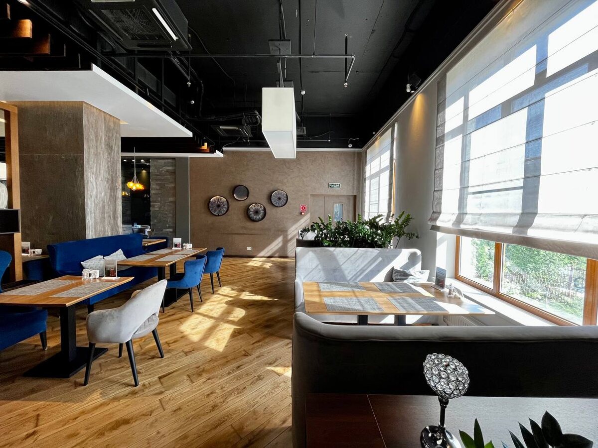 Столы расположены на достаточном расстоянии друг от друга, то есть вам не приходится подслушивать разговоры других гостей, большим спросом пользуются те, что расположены у окон, так как из них открывается потрясающий вид на Кавказский хребет.