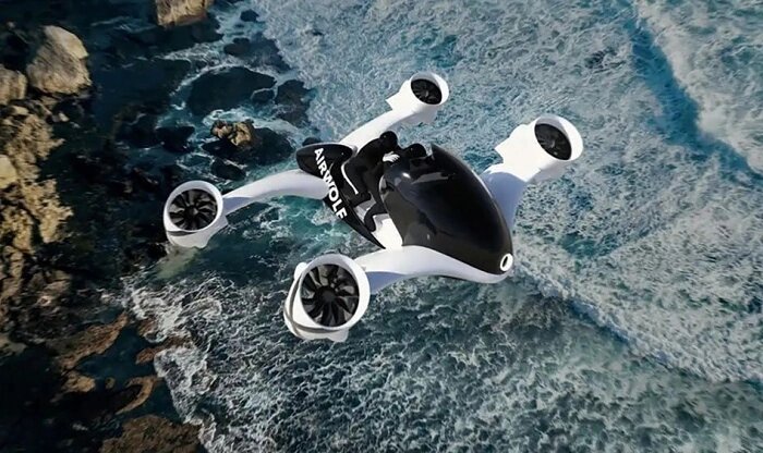 Компания UDX представила Airwolf, двухместный летающий мотоцикл (eVTOL) с наклоняемыми двигателями и общей мощностью 430 л.с. (320 кВт).