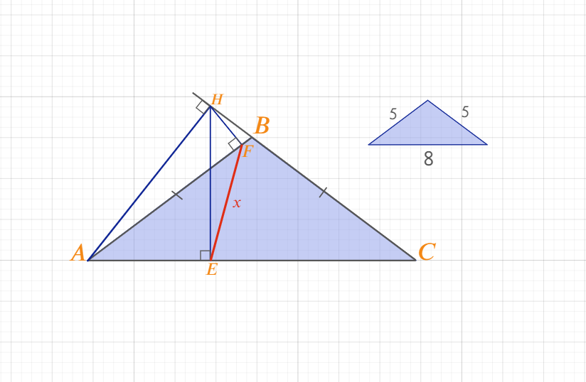 26. ★★☆ Боковые стороны равнобедренного треугольника равны 5, а его основание — 8. На продолжение боковой стороны опустили высоту AH. Найдите расстояние x между проекциями точки H на стороны AB и AC треугольника Пусть угол при основании равнобедренного треугольника равен альфа