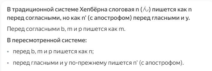 Итак, в современной языковой практике имеем: Систему Поливанова, названную автором транскрипцией, но не обеспечивающую однозначность соответствий знаков и звуков (например, знак Т может означать и звук t и африкату ʧ). С другой стороны, система имеет и выраженную черту транслитерации – точное и однозначное соответствие знаков (например, ち – всегда ТИ).