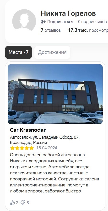 Штудируя отзывы на яндексе, наткнулся на “водольющую” речь Никиты Горелова об автосалоне “Car Krasnodar” в Челябинске: Ничего информативного. Еще бы все упомнить, ведь Никита три дня до этой покупки, купил автомобиль в Саратове, а четырьмя днями ранее - в Самаре: Зато человек доволен всеми салонами - неприхотливый покупатель. Ссылка на профиль Никиты: https://reviews.yandex.ru/user/1h1ncuk0meekvae831k2px3du0?utm_source=org&main_tab=org Все понятно без слов. Ссылка на статью - https://dzen.ru/a/Zo1d7-nmSBCu6lOa