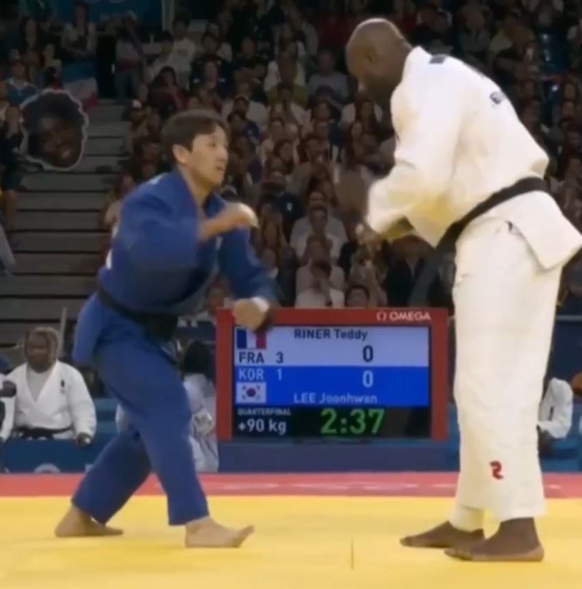 На одной стороне ковра — французский дзюдоист Тедди Ринер, величественно раскрывший свои 140 килограммов и необъятные 204 сантиметра роста. Напротив него — отважный корейский боец Ли Ен Хван, весом в 80 килограммов и с ростом 175 сантиметров. Контраст не просто заметен — он шокирует.