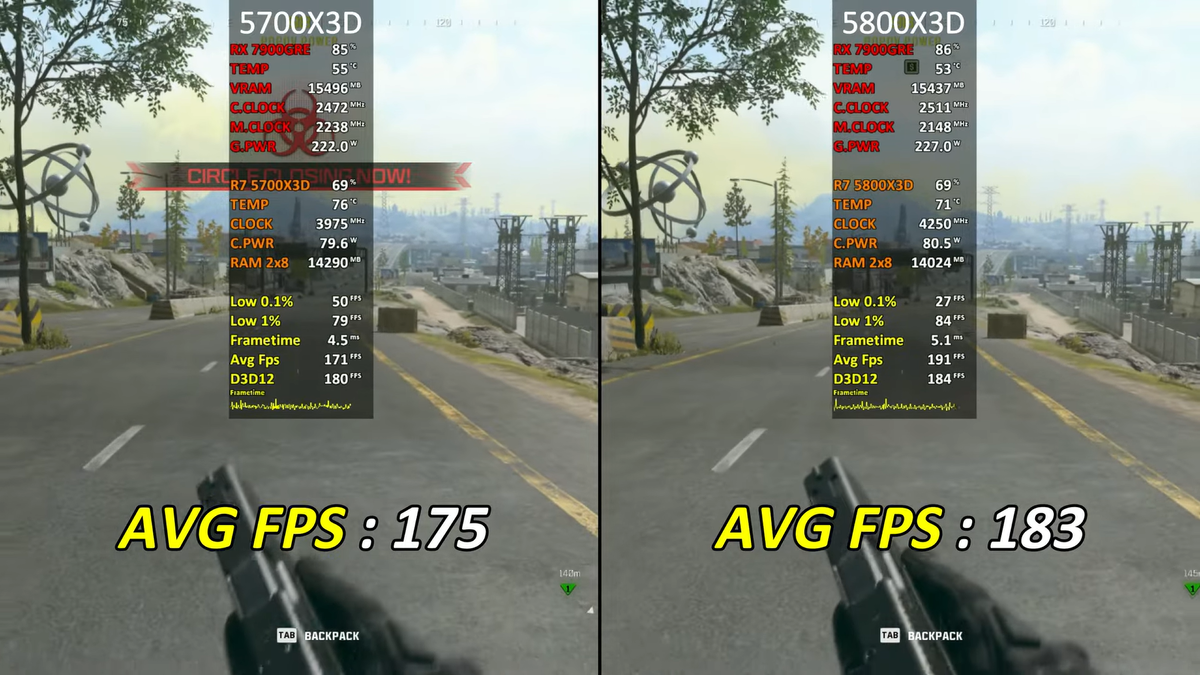 В одном из выпусков на YouTube-канале Games Choices протестировали быстродействие сборок на базе R7 5700X3D и R7 5800X3D в 1080p. Call of Duty Warzone запускалась с ультра-пресетом. Средняя производительность в ней составляла 175 к/с (5700X3D) и 183 к/с (5800X3D). Игра Spider Man Remastered шла с графикой Very High. Средний FPS равнялся в ней 169 к/с и 179 к/с (с 5700X3D и 5800X3D соответственно). В Hitman 3 с пресетом с ультра-графикой средняя частота кадров находилась на уровне 208 к/с (5700X3D) и 218 к/с (5800X3D). Hogwarts Legacy шла с TAA High, высокими настройками графики. Средняя производительность в этой игре равнялась 134 к/с (5700X3D) и 140 к/с (5800X3D). Fortnite запускалась с графикой Custom. Средняя частота кадров в этой игре составляла 146 к/с и 150 к/с (с 5700X3D и 5800X3D соответственно). A Plague Tale Requiem тестировалась с графикой Ultra Quality. Средний FPS в ней находился в районе 116 к/с (5700X3D) и 120 к/с (5800X3D). Игра Horizon Forbidden West запускалась с прес