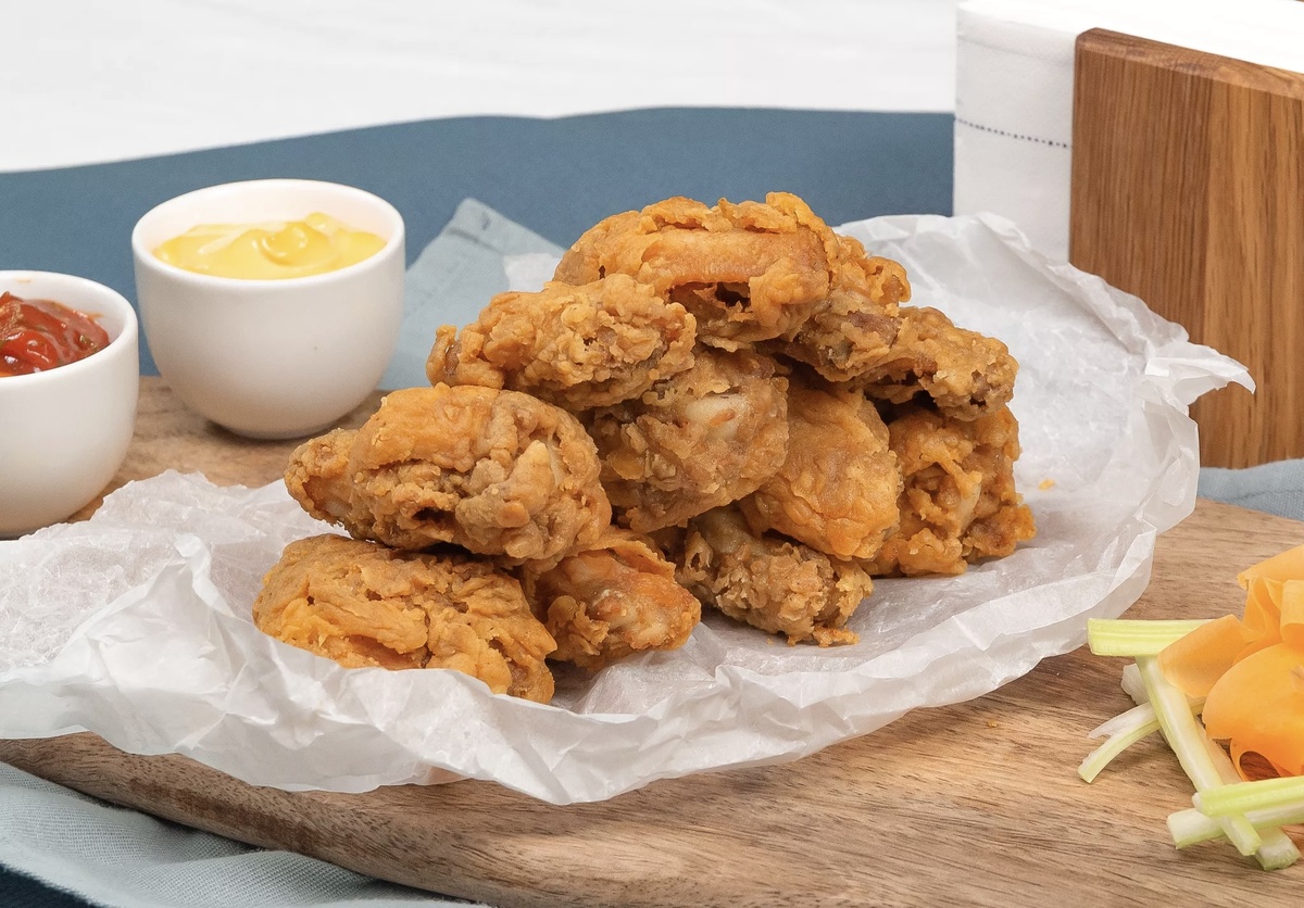 ПРОДУКТЫ ДЛЯ ПРИГОТОВЛЕНИЯ: Куриные крылышки 800 г Сладкая паприка 2 ч. л. = 12 г Вода 100 мл = 100 г Растительное масло 2 ст. л. = 34 г Сушеный чеснок 2 ч. л. = 6 г Молотый имбирь 2 ч. л. = 6 г Черный перец молотый 2 ч. л. = 10 г Молотый кориандр 2 ч. л. = 4 г Соль 0.5 ч. л. = 5 г Перец чили молотый (по желанию) 1 чл. Сладкая паприка 3 ч. л. = 18 г Соль 1 ч. л. = 10 г Пшеничная мука хлебопекарная 500 г Молотая куркума 2 ч. л. = 6 г Любой соус (по желанию) Подготовьте продукты для приготовления крылышек как в KFC. Отрежьте от куриных крылышек тонкий кончик, а сами крылья разделите на две фаланги.Совет: Для панировки можно использовать также кукурузный крахмал. Его смеши