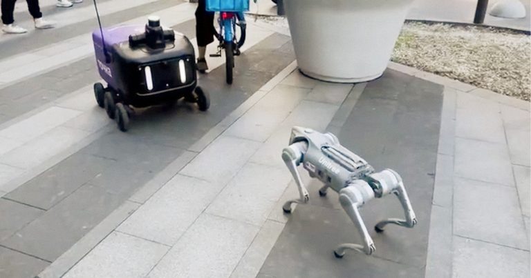 Робопес и робот-доставщик подружились у одной из башен в «Сити»