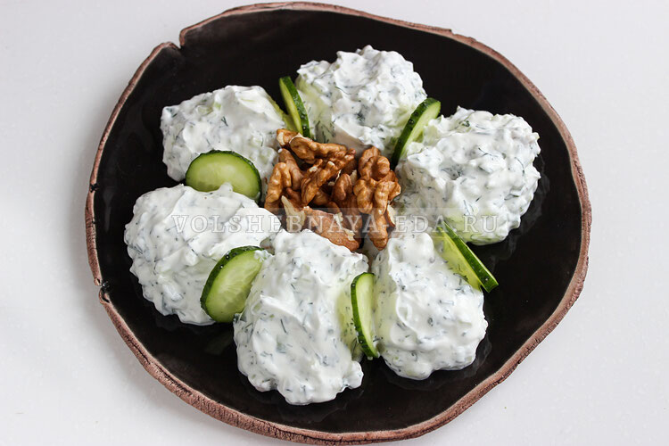 Салат «Снежанка» — известное блюдо болгарской кухни. По сути, это таратор, но более густой. Для приготовления салата «Снежанка» используется цедено мляко — отцеженное кислое молоко. В наших условиях можно использовать густой натуральный или греческий йогурт. Также традиционно в состав входят свежие огурцы, орехи, чеснок и укроп. Подают в салатнице или в виде шариков. Салат «Снежанка» очень вкусный, свежий и ароматный. Особенно хорош в летнее время года. Освежающий, хрустящий, легкоусвояемый. Йогурт откинуть на дуршлаг с мелкой сеткой, оставить на полчаса, пусть стечет лишняя жидкость. Огурцы вымыть, срезать кончики. Нарезать несколько тонких колечек, отложить для украшения. Остальное нарезать кубиками — мелко, чем мельче, тем лучше. Это как раз тот случай, когда нарезка имеет значение. В некоторых рецептах предлагают натереть огурцы на терке, но я советую все же нарезать, так структура будет гораздо лучше, а также весь сок удержится внутри кусочков, вам не придется его отжимать. Укроп