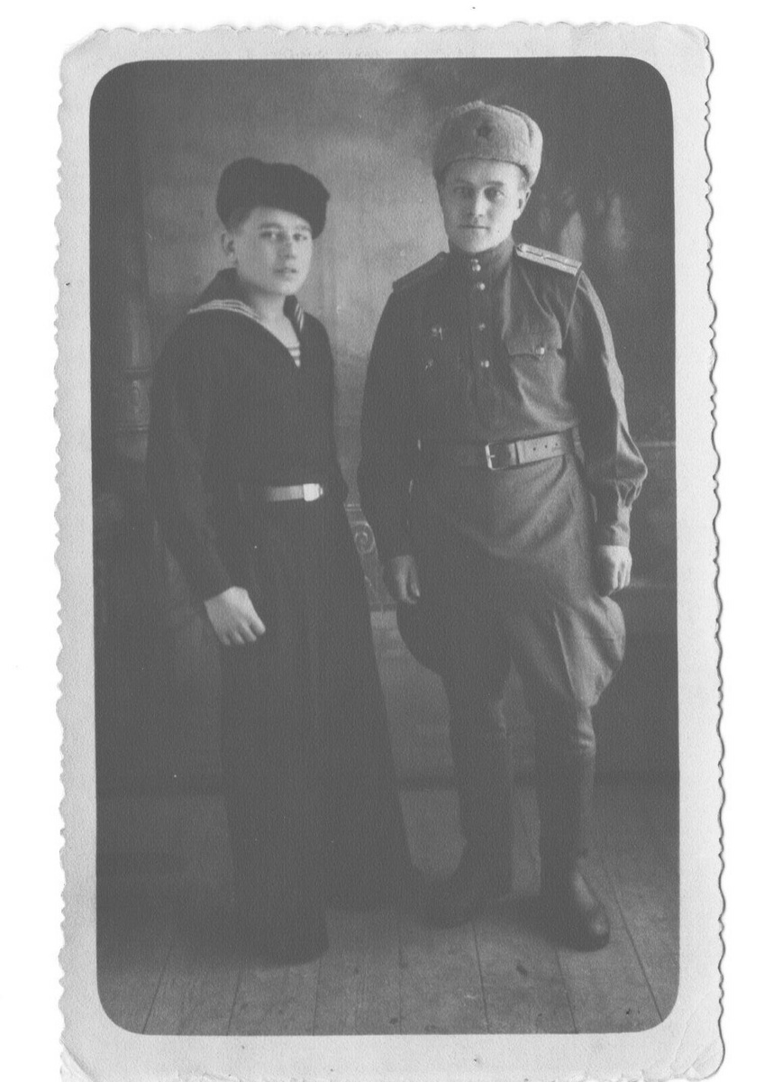 на этой фотографии Дубинин Иван Андреевич, гвардии лейтенант,награждён орденом Красной Звезды (мой прадед), слева Дубинин Иван Иванович(мой дед) закончил школу юнг и с 1943 года ушёл на морской фронт , участник северных конвоев, участвовал во взятии Пиллау и Кёнигсберга. случайная встреча отца и сына в Лиепае(май 1945 года) ПОМНЮ И ГОРЖУСЬ! Слава всем Ветеранам и Труженикам Тыла! УРА!!!
