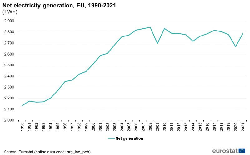 Это производство электрической энергии в Евросоюзе (27 стран) с 1990 по 2021 годы. Потом производство сократилось. Но важно не это. Даже так видно, что все реформы энергетических рынок ЕС, которые разрабатывались в конце 2000-х и запускались в 2009 году были рассчитаны на стремительно растущий рынок, на котором за 17-18 лет производство электричества увеличилось примерно на 500 ТВт*ч в год.