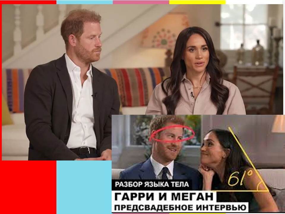 «Меган высоко поднимает подбородок, глядя на Гарри, и, вздыхает, когда он ее прерывает. Ее брови также подняты, она заламывает руки на коленях и поджимает губы, глядя на интервьюера с гораздо более серьезным выражением глаз».