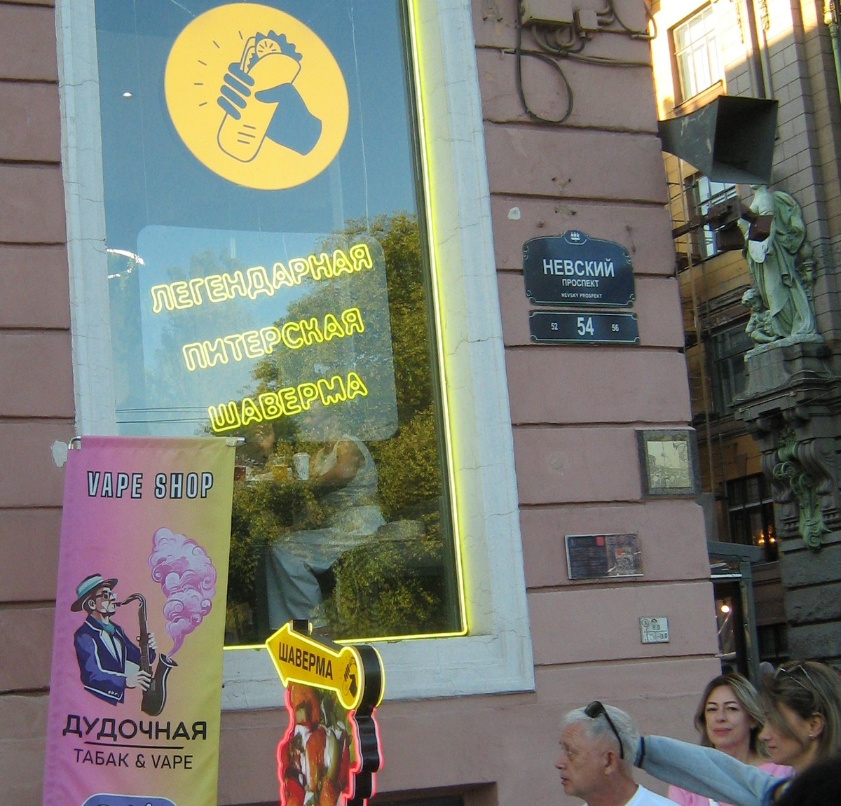 Иду недавно по Невскому мимо легендарного дома 54 – угол Малой Садовой, поднял голову – взглянул на памятник ленинградскому репродуктору, на месте ли, и остолбенел. В угловом помещении, куда ленинградцы-петербуржцы многие годы ходили за подарками и сувенирами, теперь вот Это! То, что на верхнем снимке. Вдумайтесь в это словосочетание: питерская шаверма. Да еще не просто шаверма, не просто питерская – легендарная! Видимо, открывал ее под гром шутих Петр I, а пообедать заходили Александр Пушкин с Николаем Гоголем. Мало того – тут вам еще и торговля вонючим вэпом, на который (надеюсь, не министерство здравоохранения) пытаются посадить нашу молодежь. Понимающие врачи говорят – лучше курить табак, настолько эта гадость вредна.
