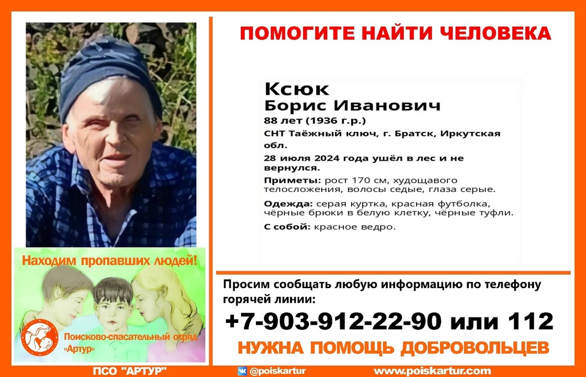 Пропал #Ксюк Борис Иванович, 88 лет, СНТ #Таёжный ключ, г. #Братск, Иркутская обл