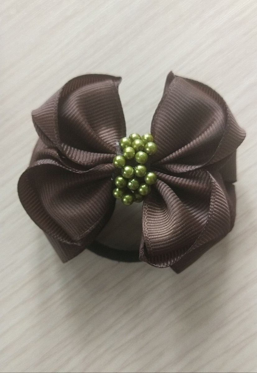 Сделаем сегодня вот такой бант. Нам понадобятся: четыре ленты шириной 4 см и длиной 13 см, а также две ленты той же ширины, но длиной 15 см. Кроме того, потребуется лента шириной 0,9 см и длиной 13 см. Предварительно обработайте концы всех лент зажигалкой. У каждой двенадцати сантиметровой ленты найдите серединку и спаяйте краешек. Затем сложите ленту следующим образом: Вот что в итоге должно получиться. Сшиваем их по две и убираем на время. У ленты по 15 см находим серединку складываем края вовнутрь и сшиваем. Ту же операцию проделываем с другой лентой, затем сшиваем их вместе. При помощи клеевого пистолета соединяю две половинки, приклеиваю их к банту. Берём нашу ленту шириной 0,9 см. Сложим её в два раза. К сожалению у меня не оказалось бусин коричневого цвета поэтому пришью к ней зелёные. Приклеиваю сзади банта резинку, а спереди нашу репсовую ленту с бусинами. Сзади фиксирую концы репсовой ленты поверх резинки. Наш бант готов.