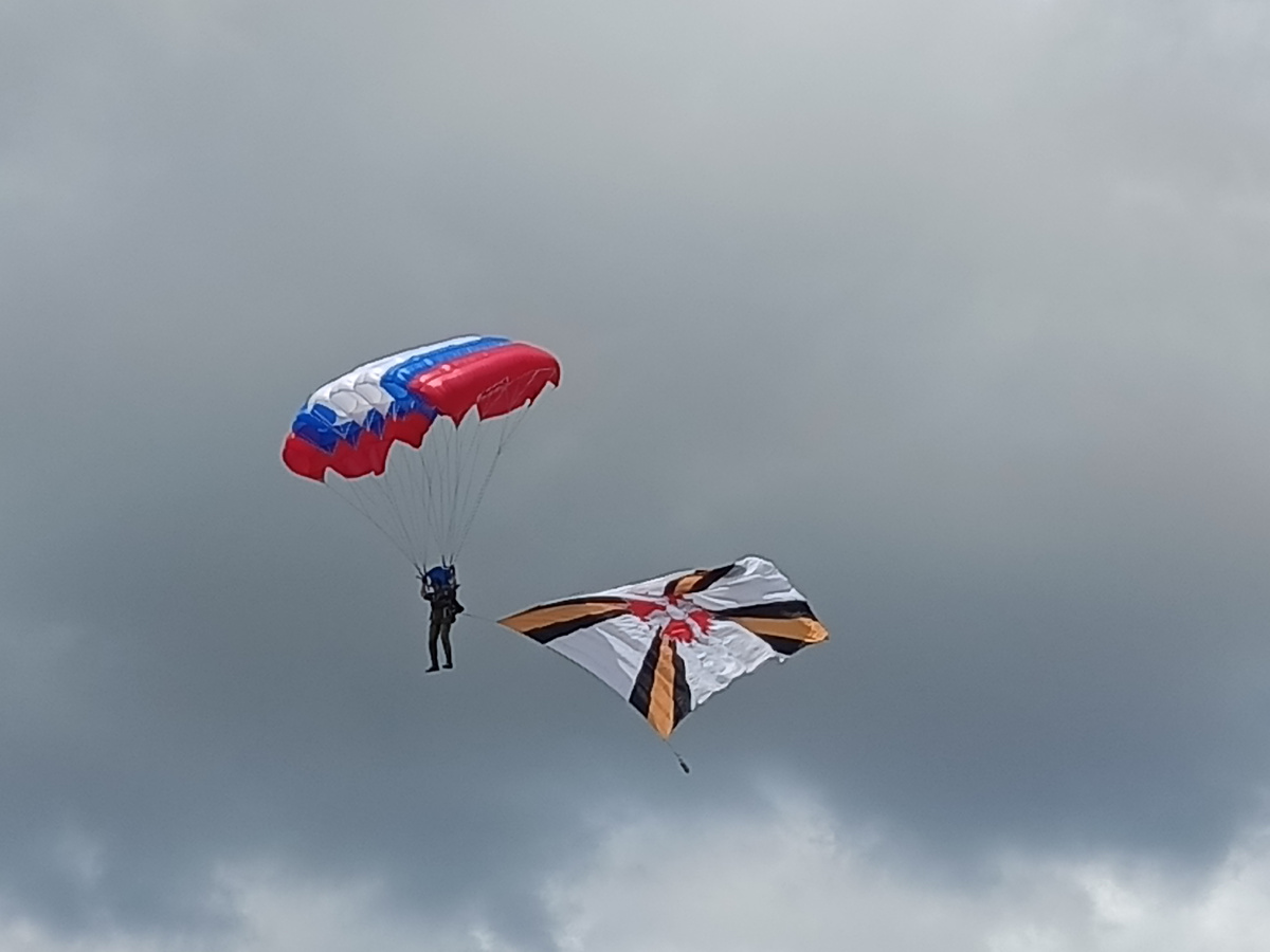 Потом десантники начали свои показательные выступления. Группа парашютистов опустилась в центре стадиона, пролетело звено самолётов.