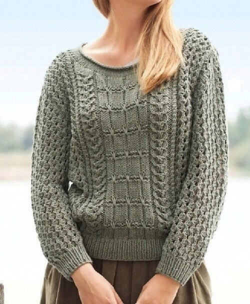 Общий рисунок собран из нескольких узоров. По желанию, можно довязать воротник и получится красивый свитер. Описание дано на размеры: 44 — 46. Для вязания вам потребуются: пряжа All Seasons Cotton (60% хлопок, 40% полиакрил, 90 м / 50 г) — 550 г, спицы № 4,5 и № 5,5. Используемые узоры Резинка 1 х 1: вязать попеременно 1 лицевую и 1 изнаночную петли. Лицевая гладь, круговые ряды: все петли лицевые. Изнаночная гладь: в лицевых рядах вяжем изнаночные петли, а в изнаночных рядах — лицевые петли. Плотность вязания: 14 п. х 21 р. = 10 х 10 см (ажурный узор) Спинка Вязание начинаем спицами № 4,5. Набираем 88 петель и вяжем резинку на высоту 5 см, закончив лицевым рядом. Затем в следующем изнаночном ряду, спицами № 5,5 продолжаем работу, распределив петли в следующем порядке: 1 кром, 16 п. ажурный узор, 2 изн, 2 п. коса А, 12 п. коса с дырочками, 22 п. рельефный узор, 12 п. коса с дырочками, 2 п. коса В, 2 изн, 16 п. ажурный узор, 1 кром. Одновременно с началом вязания основного узора, приба